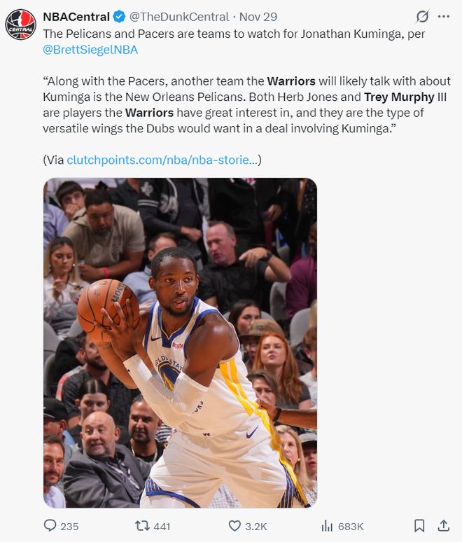 11月29日,NBA记者BrettSiegel就曝出过,鹈鹕与步行者正在关注库明加,勇士队对鹈鹕队的赫伯特-琼斯、特雷-墨菲都非常感兴趣,他们很希望在涉及库明加的交易中得到这样的侧翼多面手。